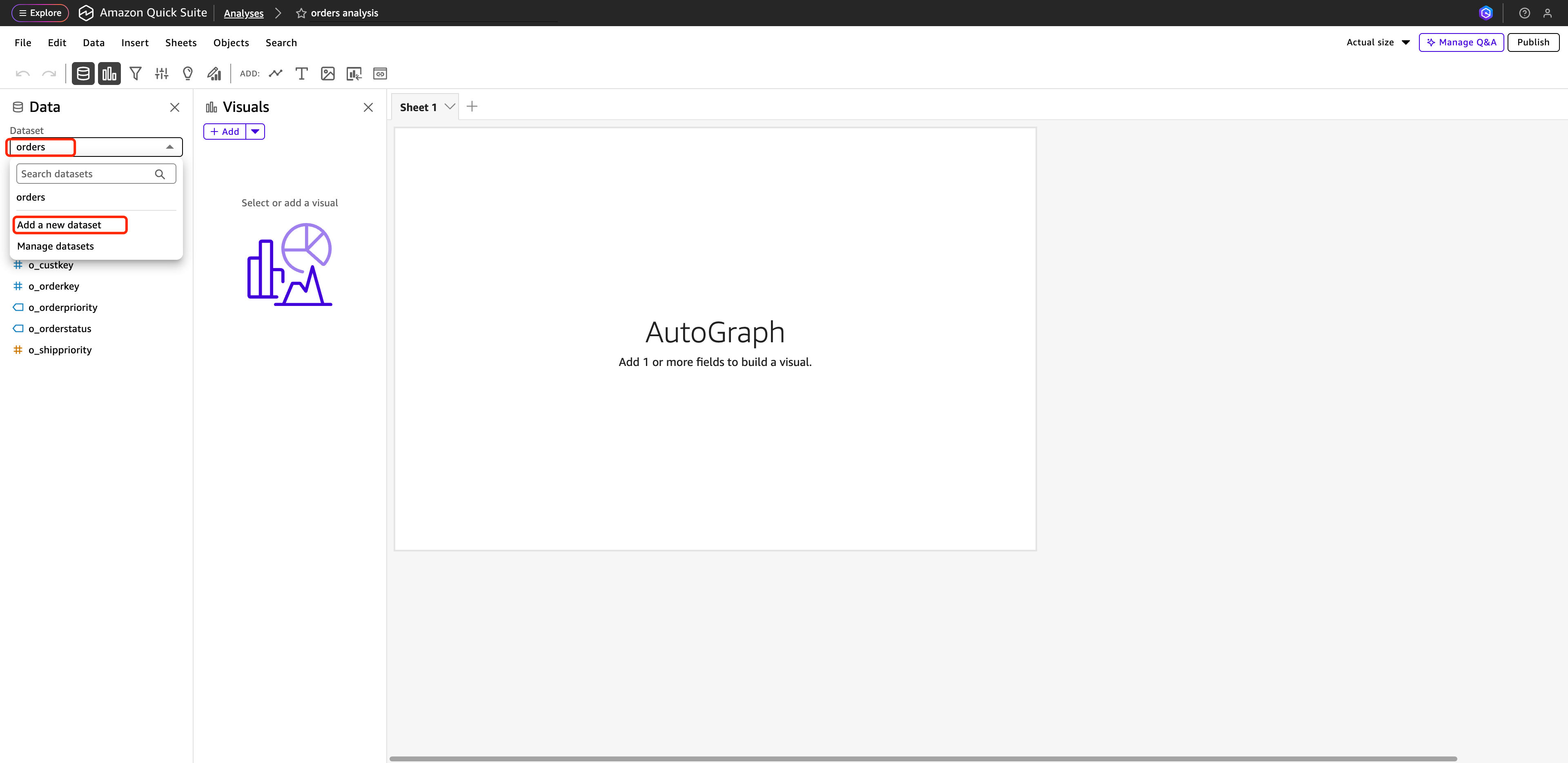 - ダッシュボード作成ワークベンチに入り、現在のDatasetドロップダウンメニューをクリックし、Add New Datasetを選択します。