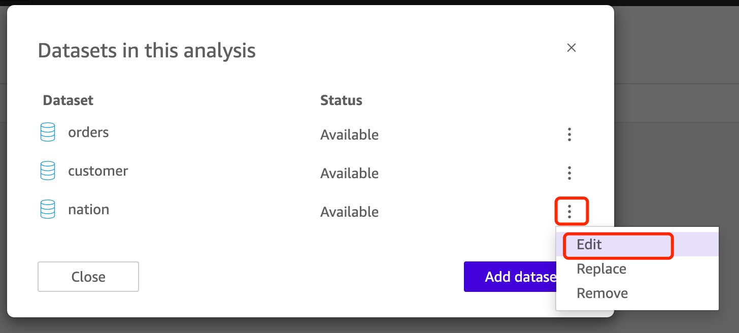 - 完了後、nationの操作インターフェースをクリックして、データセット編集インターフェースに入ります。これから、データセット上で列結合を実行します。