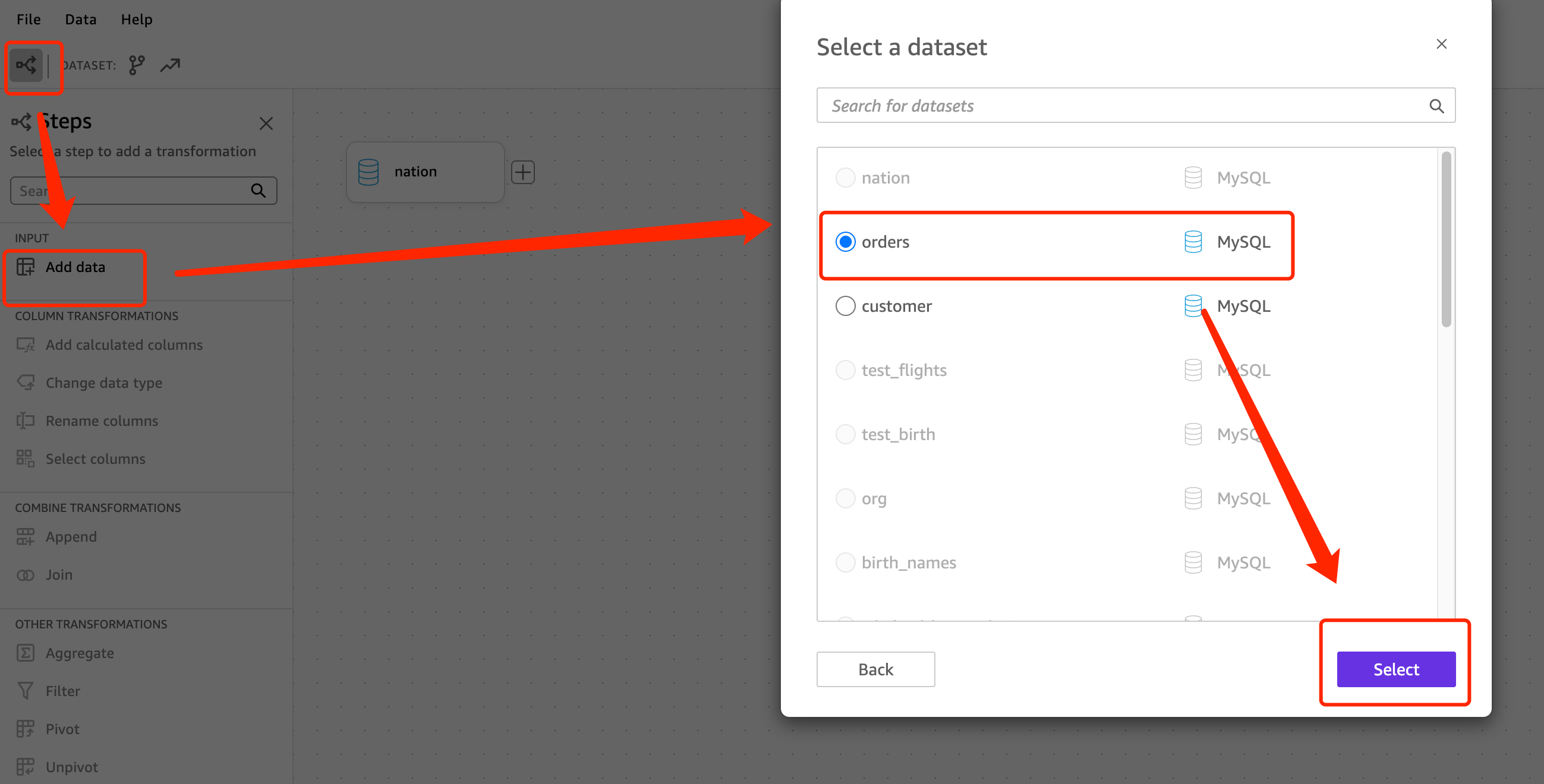 - すべてのデータセットを順番に選択し、Selectをクリックして、ダッシュボードに追加します。