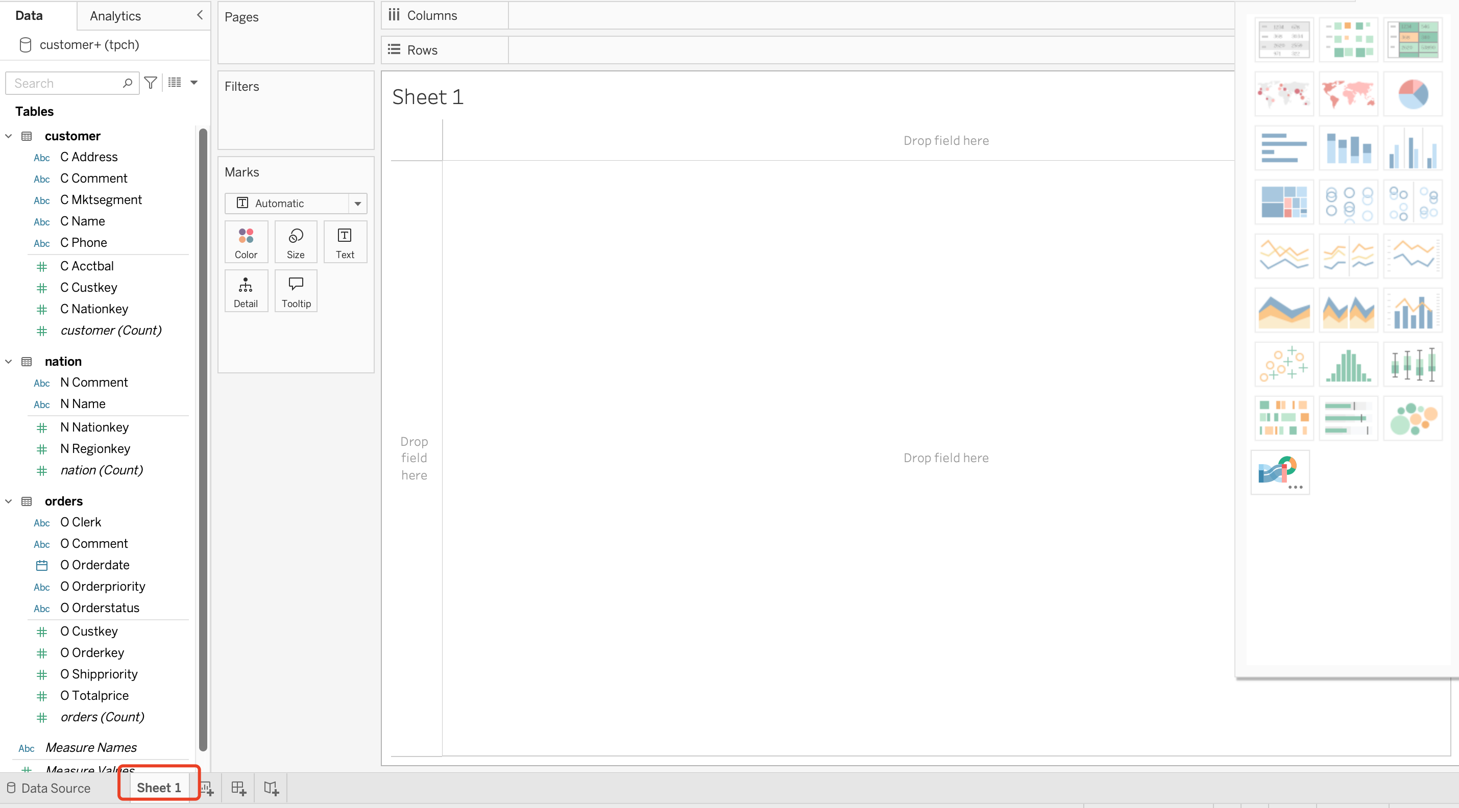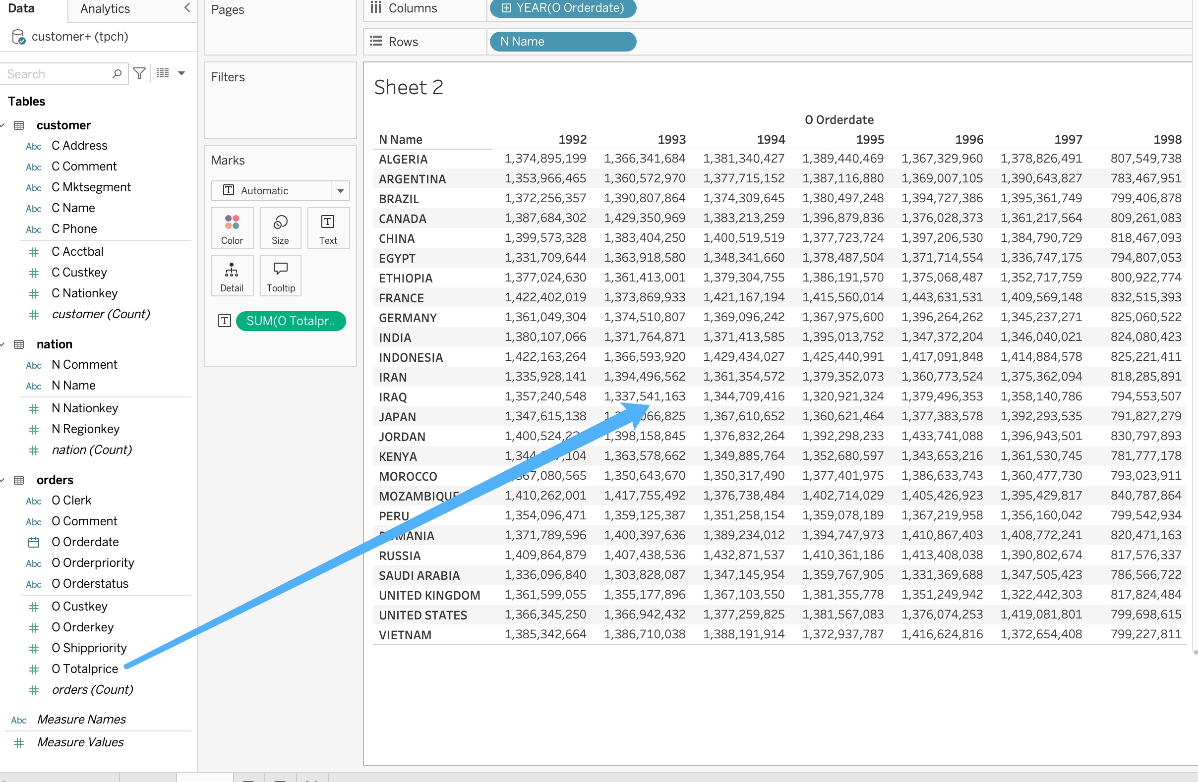 - 现在您已经将 customer 表、 orders 表 和 nation 表关联为数据源,因此您可以利用此关系处理有关数据的问题。选择工作簿底部的