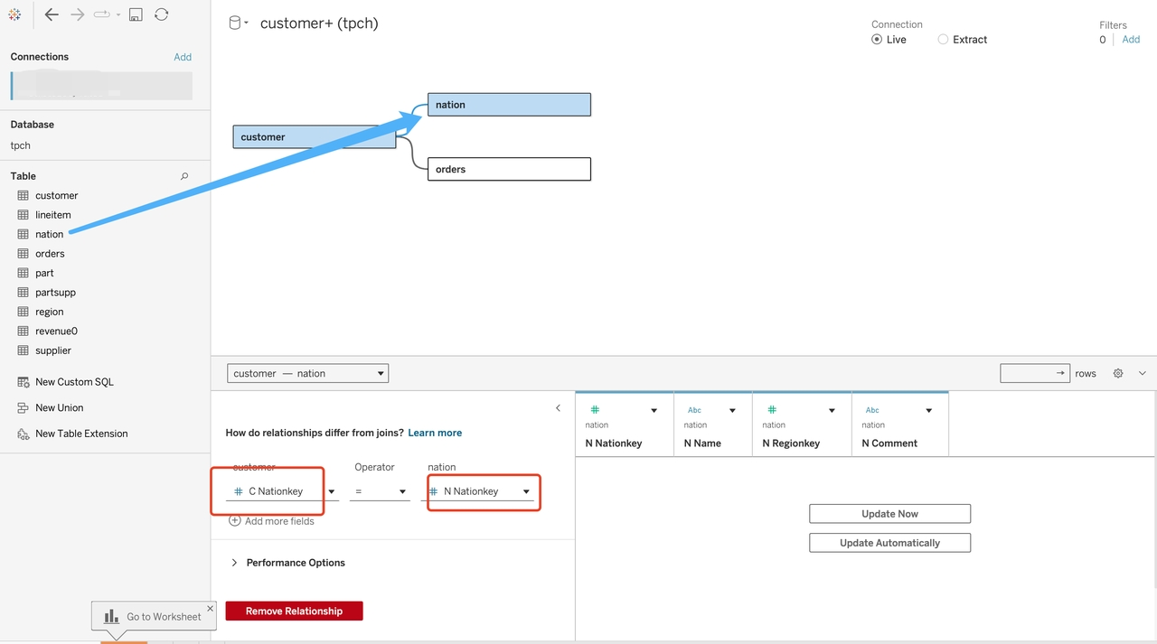 - 将 nation 表拖到工作簿中 并 与 customer 表 选定表关联字段 Nationkey