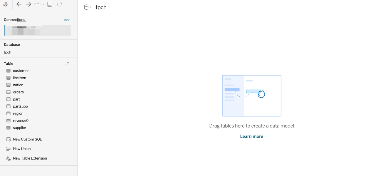 现在您已安装并设置了 JDBC 和 Connector 驱动程序,让我们来看一下如何在 Tableau 中定义一个连接到 Doris 中 tpch 数据库的数据源。
