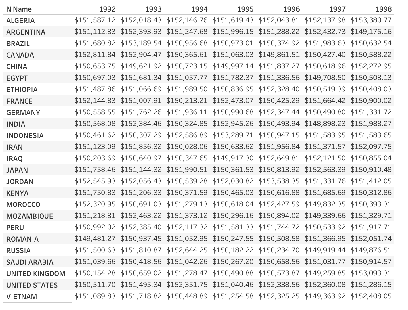 - 假设您想知道按地域(国别)和 年份计算的平均订单金额(美元):