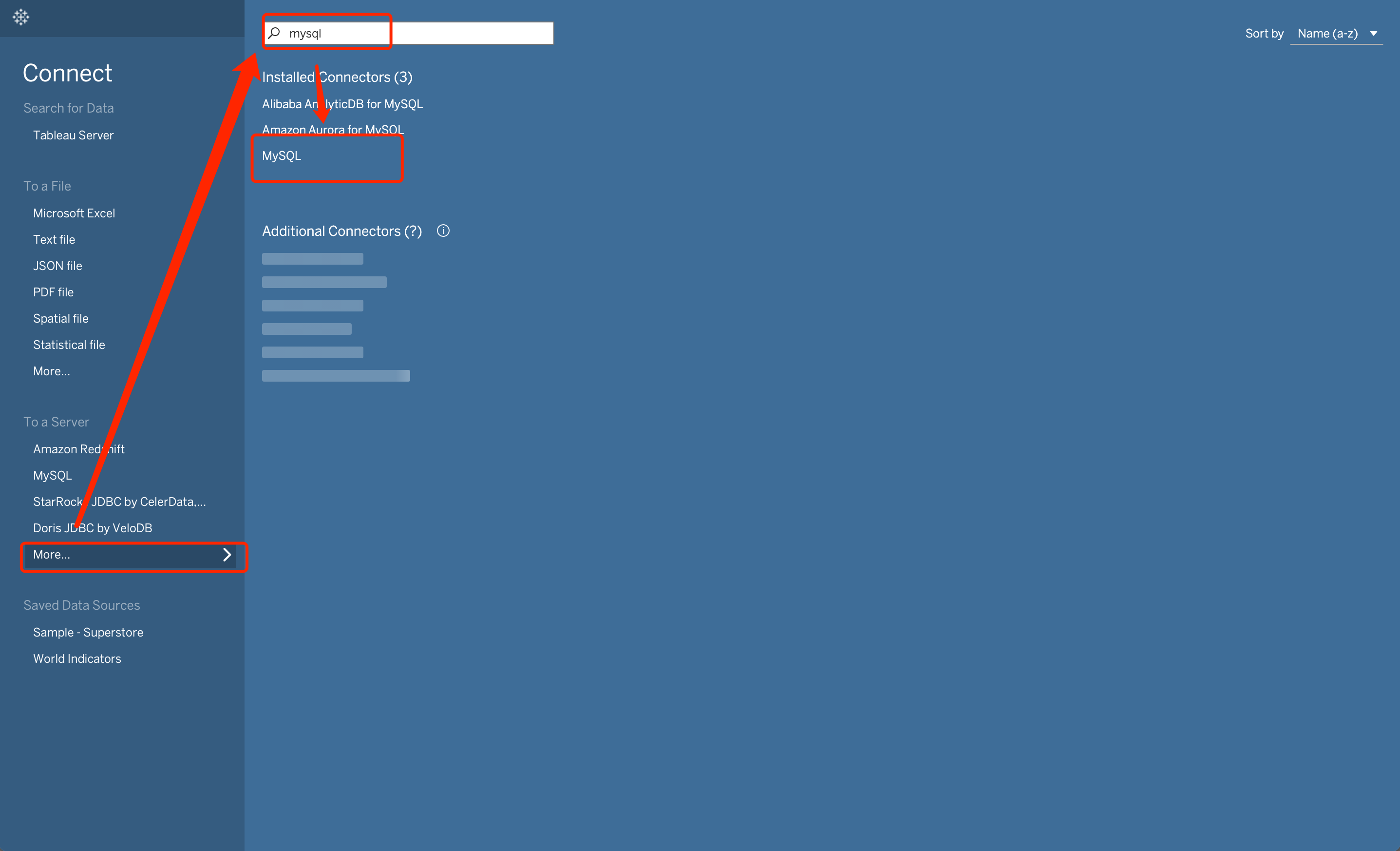 - 从左侧菜单中,点击 To a Server 部分下的 More。在可用连接器列表中搜索 mysql