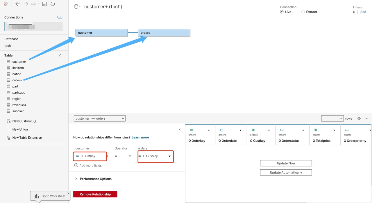 - 将 customer 表 和 orders 表拖到工作簿中。并在下方为他们选定表关联字段 Custkey