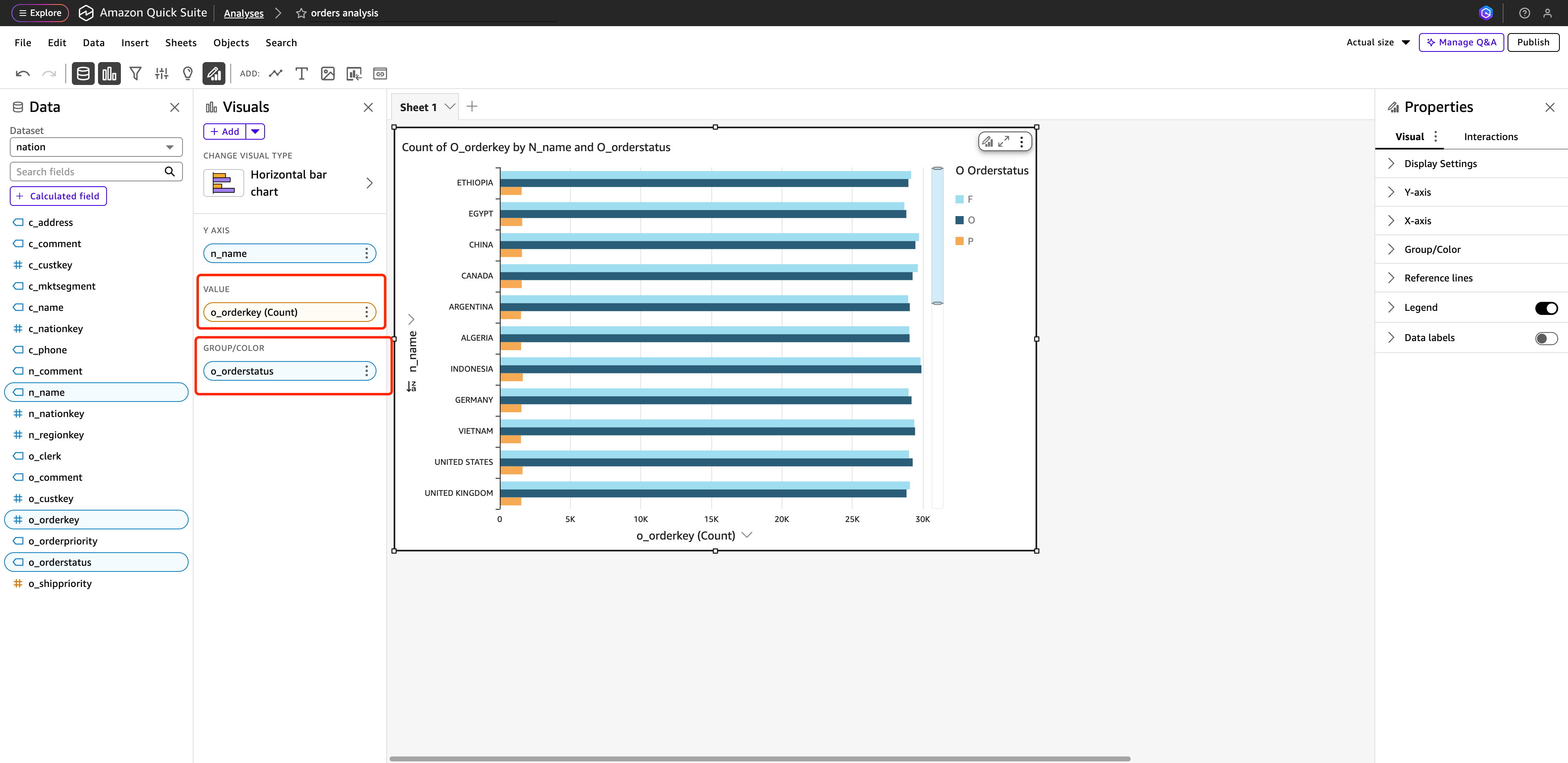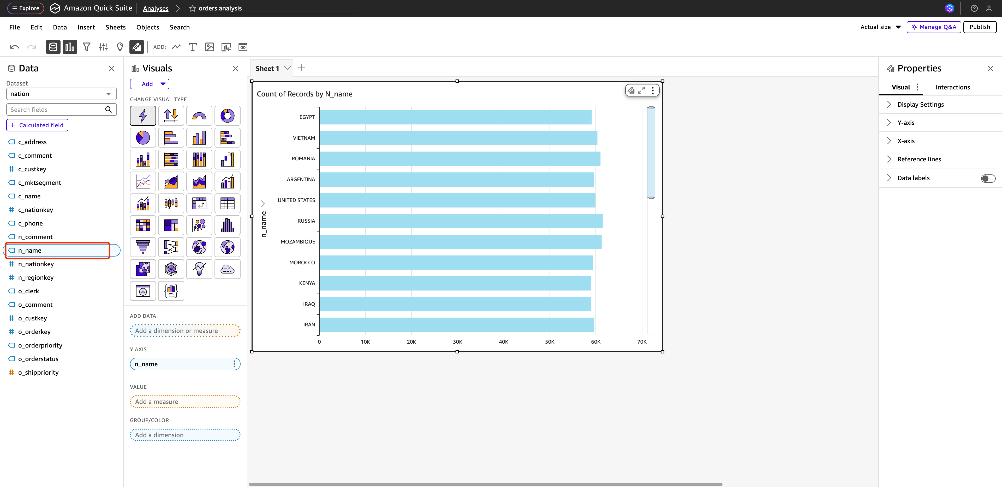 - 回到刚刚添加三个数据源的 Analyses 界面,点击 n_name 出现按 国家名称的订单总数统计图