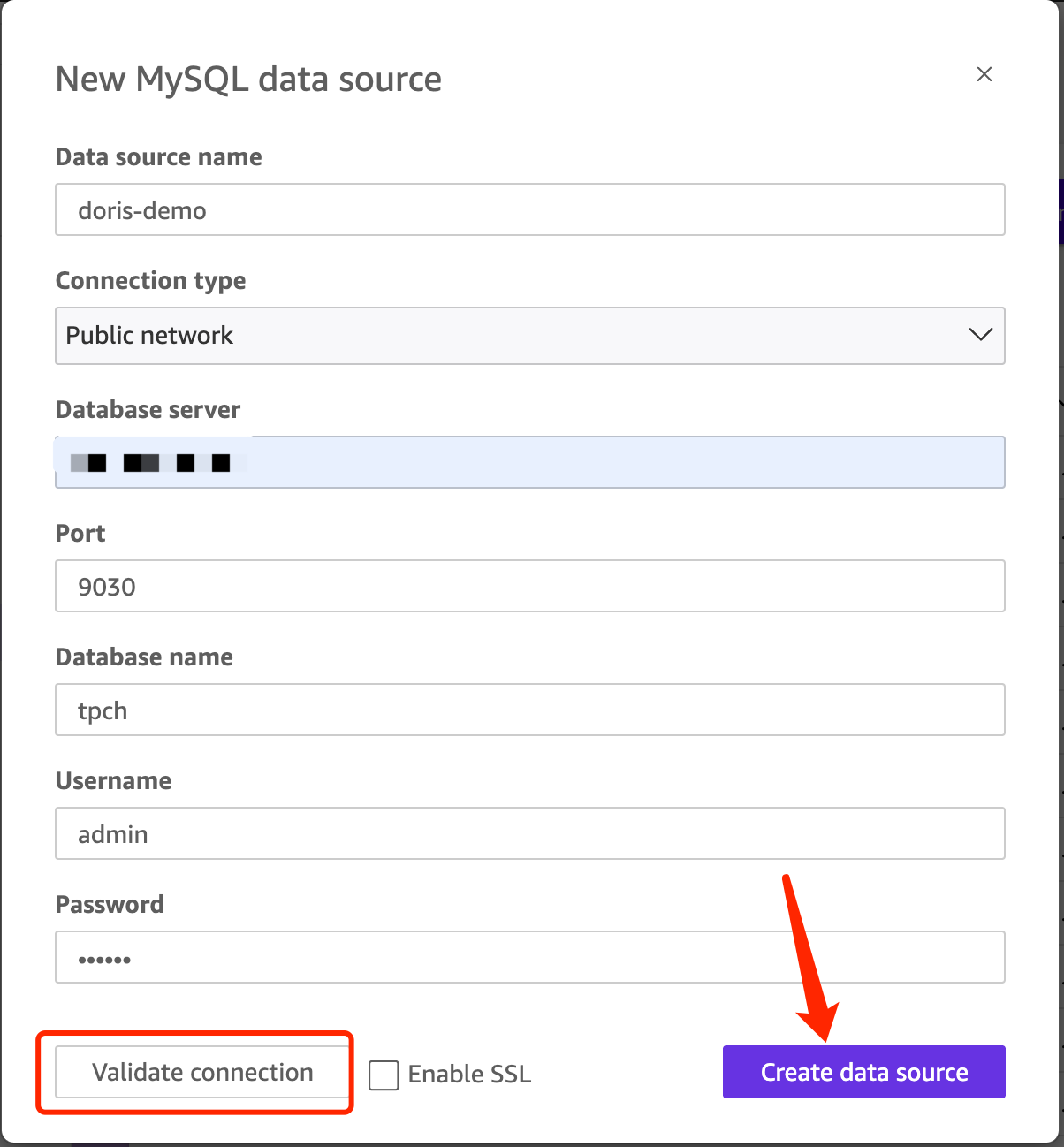 将 QuickSight 连接到 Apache Doris