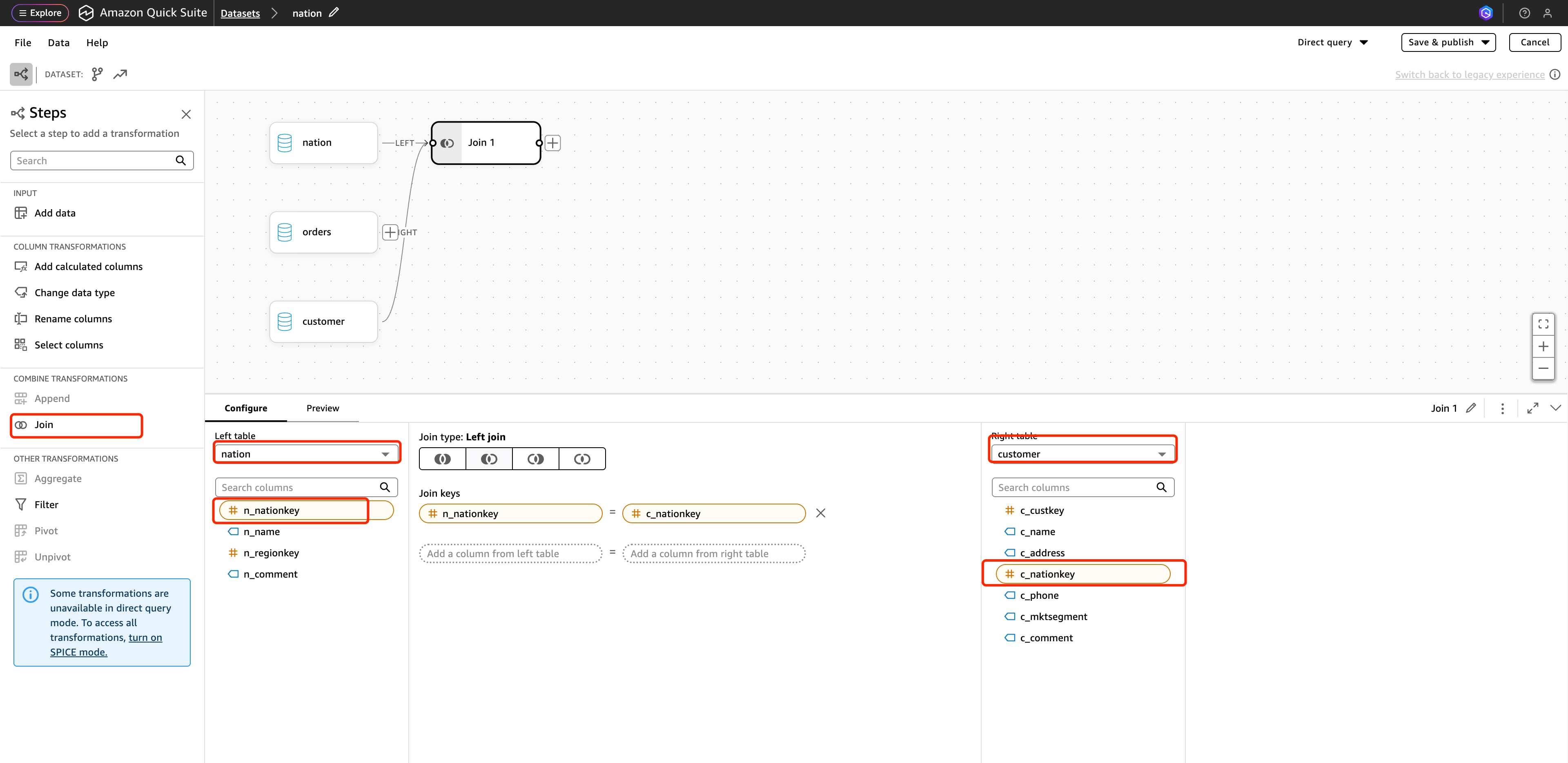 此外,通过点击 “Edit/Preview data”,您应该能够看到内部结构的表结构或调整自定义 SQL ,并且可以在此处进行 数据集的调整: