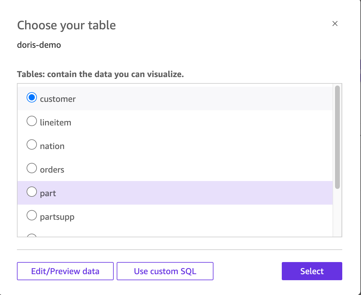 QuickSight 可以通过官方 MySQL 数据源以 Directly query 或 Import 模式连接到 Apache Doris
