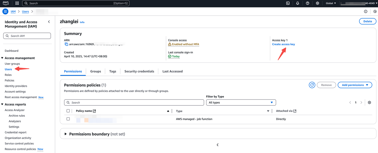 - 登录 AWS IAM 控制台,在左侧导航栏选择