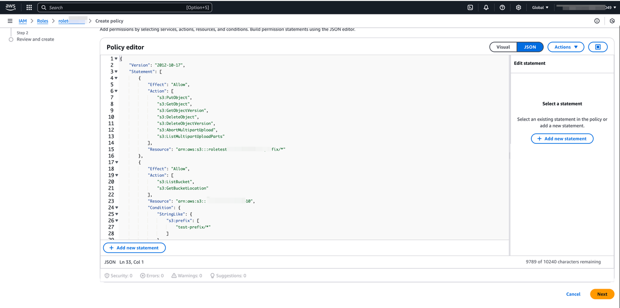 - 在策略编辑器中填入对应的 AWS 资源策略,下文以访问 S3 Bucket 资源为例列出了读/写策略的常见模板