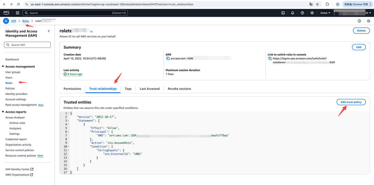 Access management > Roles找到Assumed Target Role,单击角色名称 在角色详情页上; - 单击